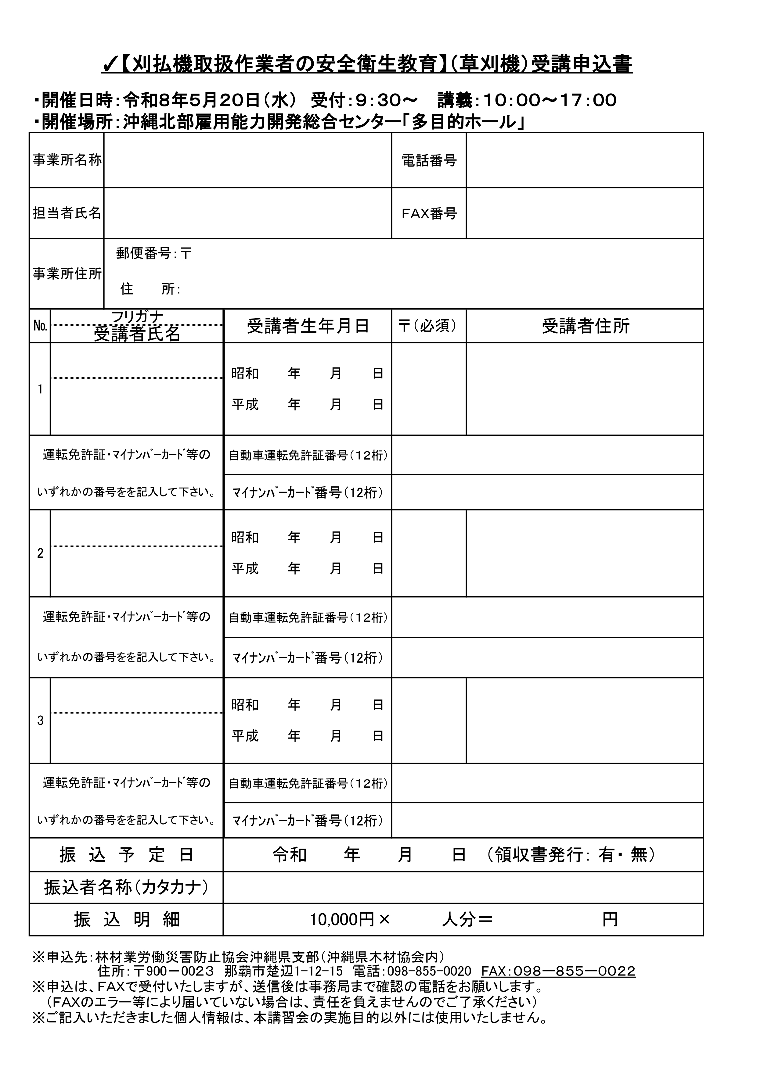・返送先事務局 林材業労働災害防止協会沖縄県支部【那覇市楚辺1-12-15、沖縄県木材協会内】